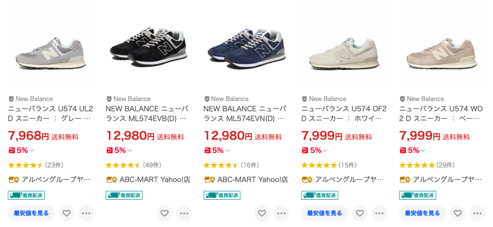 Yahoo!ショッピングに売ってるニューバランスの相場は、定番の574シリーズだと8,000円前後でした。