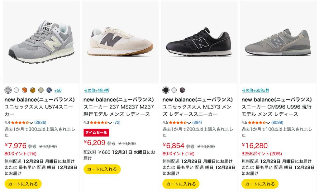 Amazonに売ってるニューバランスの相場は、定番の574シリーズだと11,000円前後でした。